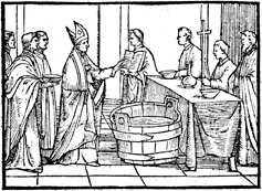 Description: This engraving is the fourth of seventeen illustrating the dedication or consecration of a church. The bishop blesses vessels filled with salt, ashes and water.