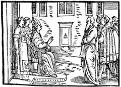 Description: This engraving is the eleventh of seventeen illustrating the dedication or consecration of a church. The bishop, seated on a throne before the doors of the church, gives a brief sermon to the assistant priests and the people gathered there.