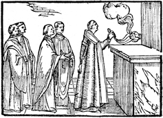 Description: This engraving is the thirteenth of seventeen illustrating the dedication or consecration of a church. The bishop consecrates the altar with incense, swinging the censer in the sign of the cross over its middle and four corners.