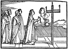 Description: This engraving is the fourth in a series of four that illustrates the consecration of a cemetery. In this engraving, the bishop blesses each cross with incense from the thurible and then places a lit candle at the top of the vertical post and two more candles at each end of the horizontal beam.