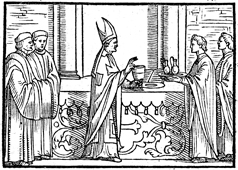 Description: The bishop holds the chalice in his hand and blesses it, as an attendant priest stands nearby holding a small tray with two cruets (small containers for the wine to be used in Eucharist).