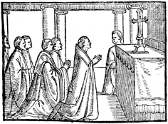 Description: This is the second of two engravings illustrating the blessing of a new cross for a church. The bishop kneels before the cross, now placed on the altar.