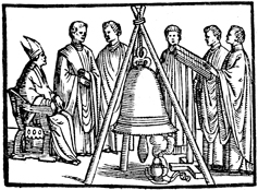 Description: This is the first of three engravings illustrating the blessing of a new bell for a church. The bell is set up inside the church for the blessing. The bishop is seated while several Psalms are chanted.