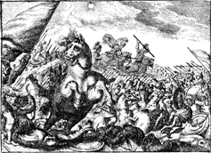 Description: Joshua and the Israelite army defeat the united Amorite armies, as the sun stands still.