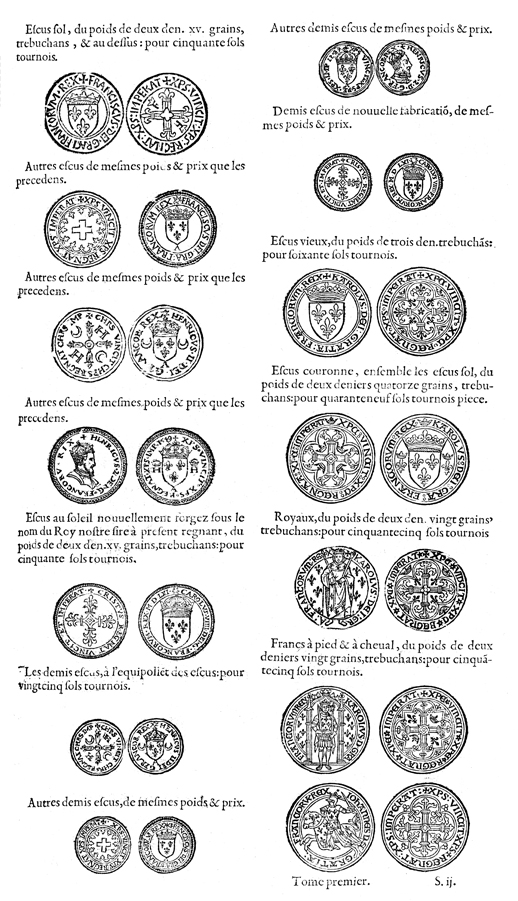 Description: A collection of French coins ranging from a half-crown (or demi-écu) worth twenty-five sous, to an old crown worth sixty sous. Most of these coins bear the names of sixteenth-century kings: Francis I (r. 1515-1547), Henry II (r. 1547-1559), and Charles IX (r. 1560-1574). The large coins on the page's right side, however, appear to belong to older kings. Of these coins, the final two are especially noteworthy: the franc à pied, first minted by Charles V of France (r. 1364-1380; depicted standing with a sword and the Hand of Justice), and the franc à cheval, first minted by John II (r. 1350-1364; depicted riding a horse with sword raised).