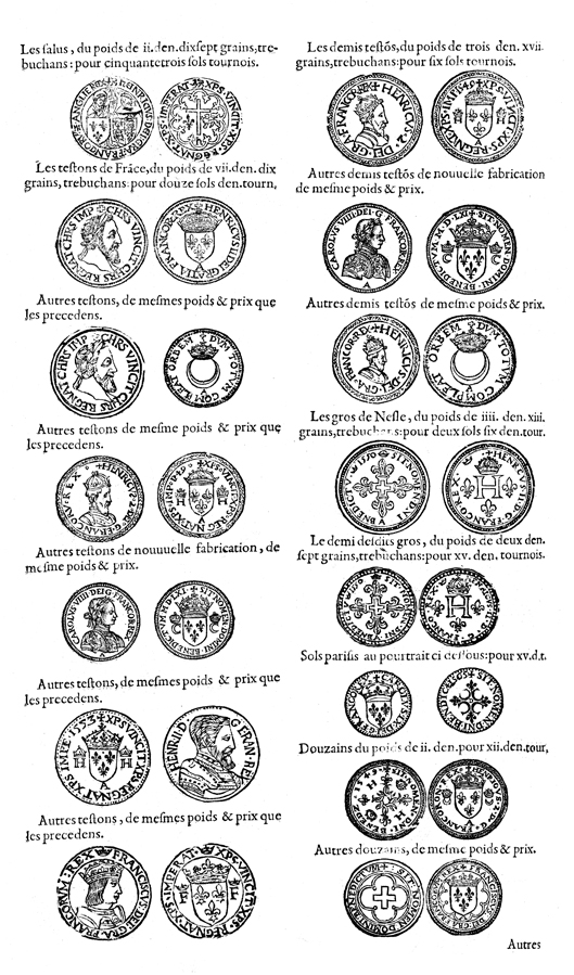 Description: A collection of French coins, most of which bear the names of sixteenth-century French kings: Francis I (r. 1515-1547), Henry II (r. 1547-1559), and Charles IX (r. 1560-1574). The only exception is the gold salute (the uppermost coin on the left side); it was issued by English kings Henry V (r. 1413-22) and Henry VI (r. 1422-61, 70-71) during the Hundred Years' War. The salute features Mary behind the shield of France, and the angel of the Annunciation standing behind the shield of Henry V, reading from an open scroll.