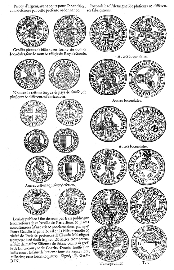 Description: This page contains images of thalers (called jocondales in the text) which circulated in Europe during the sixteenth century. The top left coin, a silver thaler, depicts Count Willem IV van den Berg (d. 1586), a stadtholder of the southern Netherlands, armed and on horseback. Below, a half-thaler features the name, image, and crest of King Eric XIV of Sweden (r. 1560-1568). A series of Swiss testons follows: the first features a double eagle above the symbol of Bern, a bear; the next two feature the arms of Lucerne and portraits of the martyred bishop Léger (d. 679; also called Leodegar); and the column's final coin contains the arms of Solothurn, along with a portrait of its patron saint, the late-third-century martyr Ursus of Solothurn.
