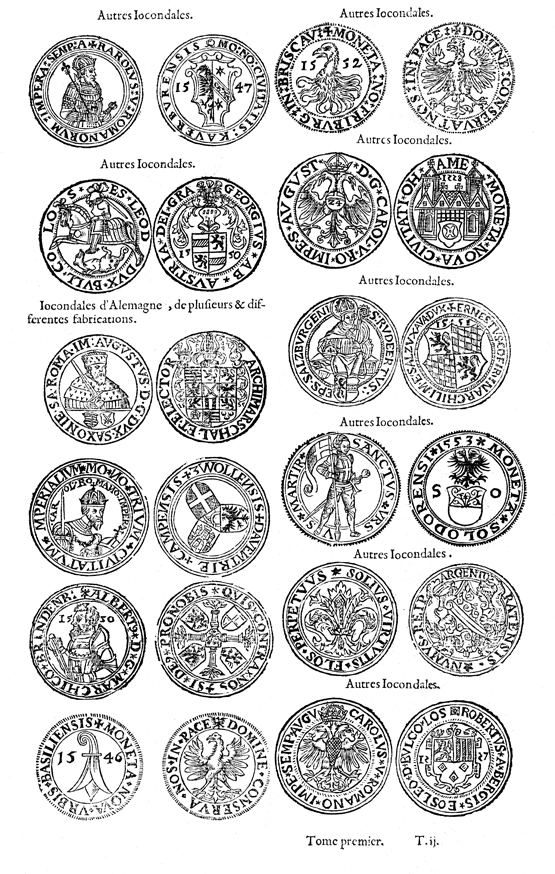 Description: This page contains images of silver thalers (called jocondales in the text) which circulated in Europe during the sixteenth century. The top left thaler features a portrait of Holy Roman Emperor Charles V (r. 1519-1556), opposite the arms of the Bavarian town of Kaufbeuren. Below this coin appears one with an image of Saint George slaying a dragon; the other side features the arms of George of Austria, prince-bishop of Liège from 1544 to 1557. The next three thalers contain bust portraits: the first features Augustus I, Elector of Saxony (r. 1553-1586), with his coat of arms; next appears Charles V, opposite the linked arms of Dutch cities Zwolle, Deventer, and Kampen; then appears Albert Albiciades, Margrave of Brandenburg-Kulmbach (r. 1527-1553). The column's final coin is of Basel, Switzerland, and features the city's symbol, a hooked staff resembling a crosier.
