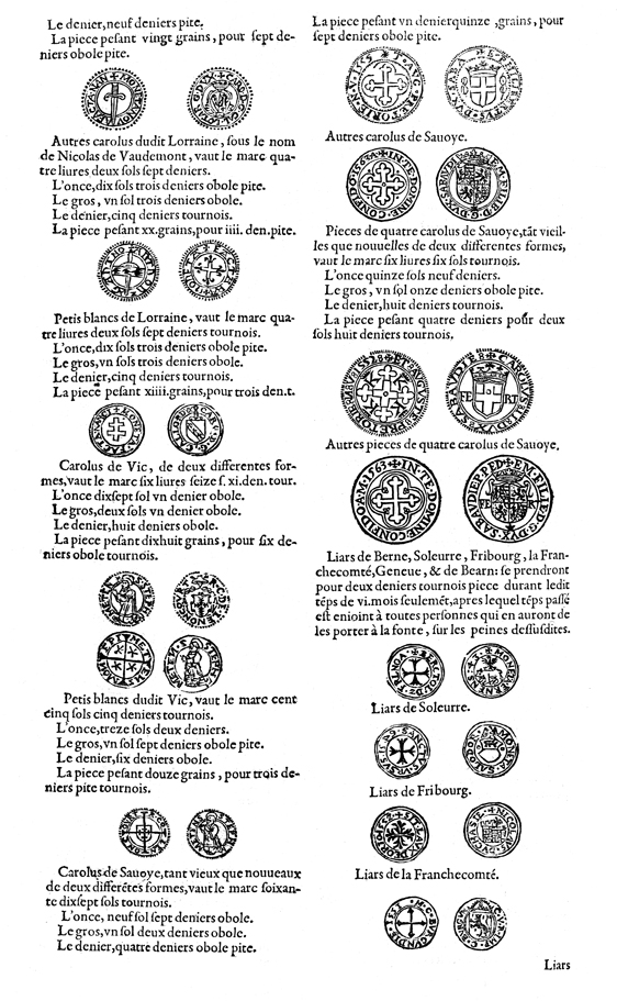 The right column includes several forms of the carolus used in Savoy. The basic carolus appears in two forms: one with the Duchy of Savoy's crowned arms, the other with the arms of Savoy's Duke Emmanuel Philibert (r. 1553-1580). Next appear two forms of the more valuable quatre carolus, and of these only the upper form is unique: it modifies the clover cross of other Savoyard coins by adding four letters K in the regions between the cross's arms, marking the reign of Duke Emmanuel's predecessor, Charles (Karolus in Latin) III (r. 1504-1553). Finally, the page concludes with liards from Bern, Solothurn, Fribourg, and Franche-Comté, each of whose arms appear on the right coin face.