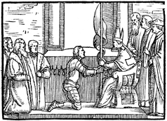 Description: The bishop blesses a military banner with water and then hands it to a soldier.