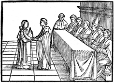 Description: This is the second of four engravings illustrating the blessing of several holy oils on Holy Thursday. The archdeacon presents a vessel containing oil to the bishop for his blessing.