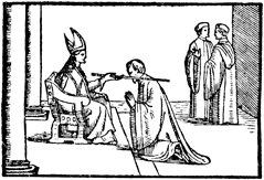 Description: This engraving illustrates one part of the rite of absolution for a priest who had been excommunicated. The one to be absolved kneels before the bishop who is seated outside of the church. The bishop holds a switch in his hand with which he lightly beats the shoulders of the one to be absolved, while a psalm is recited.