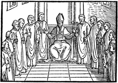 Description: This engraving illustrates the rite of solemn excommunication. The bishop sits surrounded by twelve priests in a public place, each with a lit candle in his hand. The bishop then pronounces the anathema against the one to be excommunicated, after which all strike out their candles against the ground.