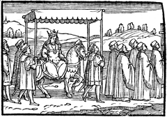 Description: This engraving illustrates an empress or queen traveling in procession with a canopy held above her head.