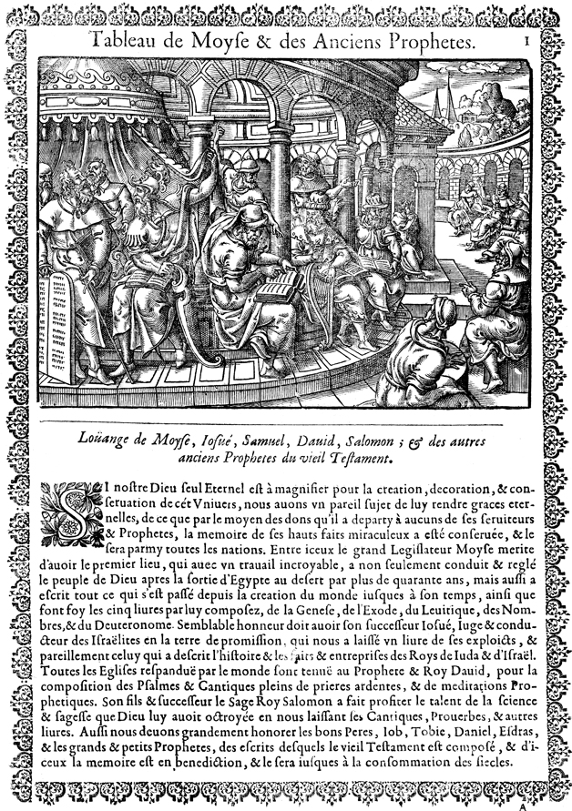 Description: In this image, the Old Testament prophets lounge and converse in a courtyard with their writings open before them. Featured prominently are Moses, Joshua, Samuel, David, and Solomon.