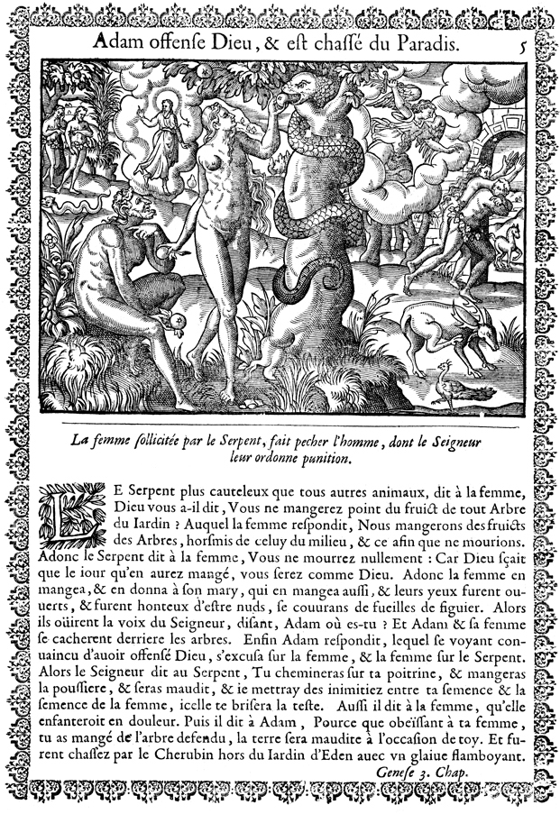 Description: In the foreground of this image, Adam and Eve partake of the fruit of the Tree of the Knowledge of Good and Evil. In the background, God confronts Adam and Eve over their disobedience. They are subsequently banished from the Garden of Eden and prevented from returning by the cherubim wielding a flaming sword.