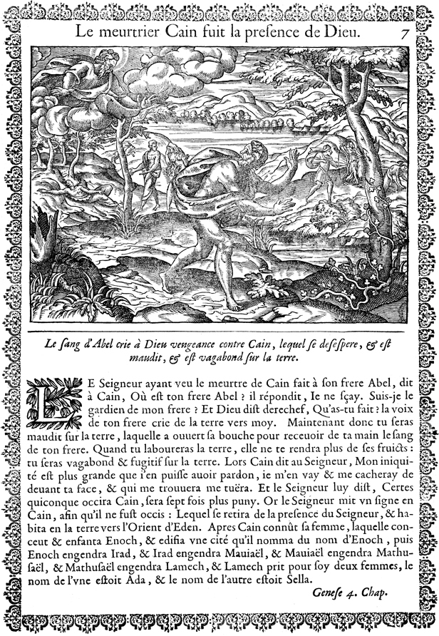 Description: God curses Cain and drives him from his presence for the murder of Abel. In the background, Adam and Eve come upon Abel’s corpse, and mourn.