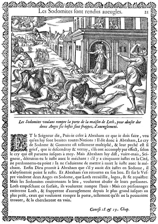 Description: Two of the three angels that had visited Abraham now visit Lot in Sodom. The men of the city threaten the visitors. In response, the angels strike them with blindness.