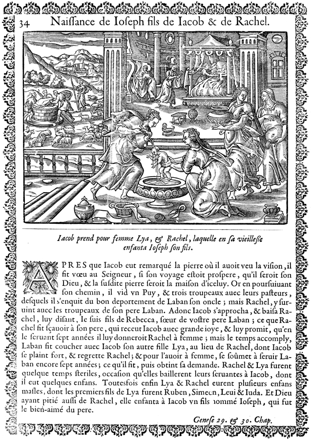 Description: In the foreground, maids bathe Jacob and Rebekah’s newborn son, Joseph. In the background, maids tend to Rebekah after the birth. Outside, Joseph’s older brothers plot to throw him into a pit.