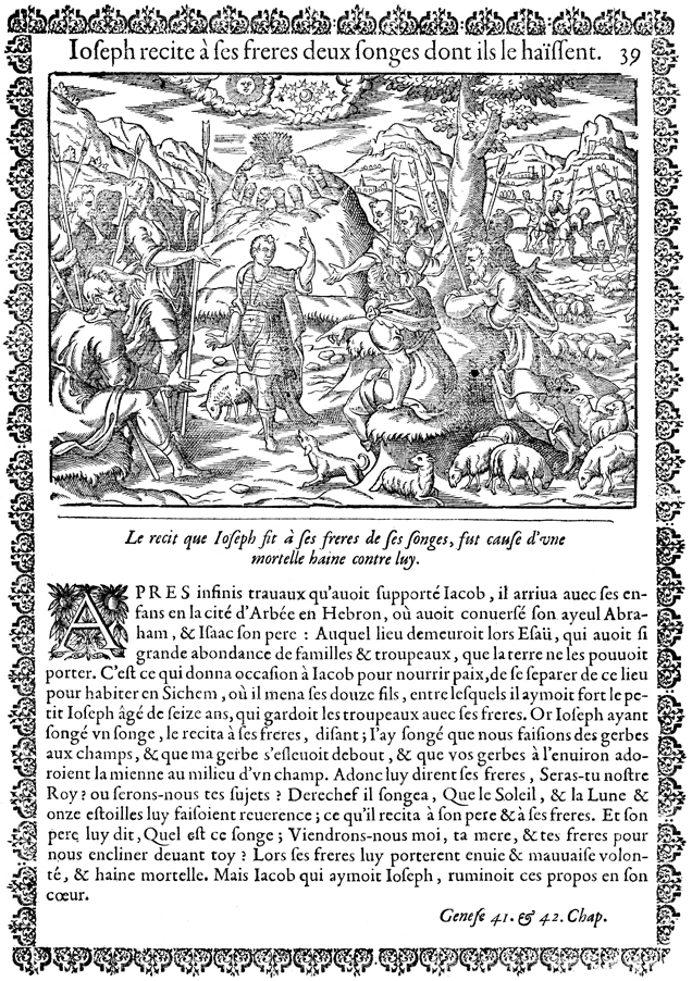 Description: In the foreground, Joseph recounts his dreams of greatness to his brothers. In the background, his brothers lower him into a cistern in a plot to rid themselves of him.