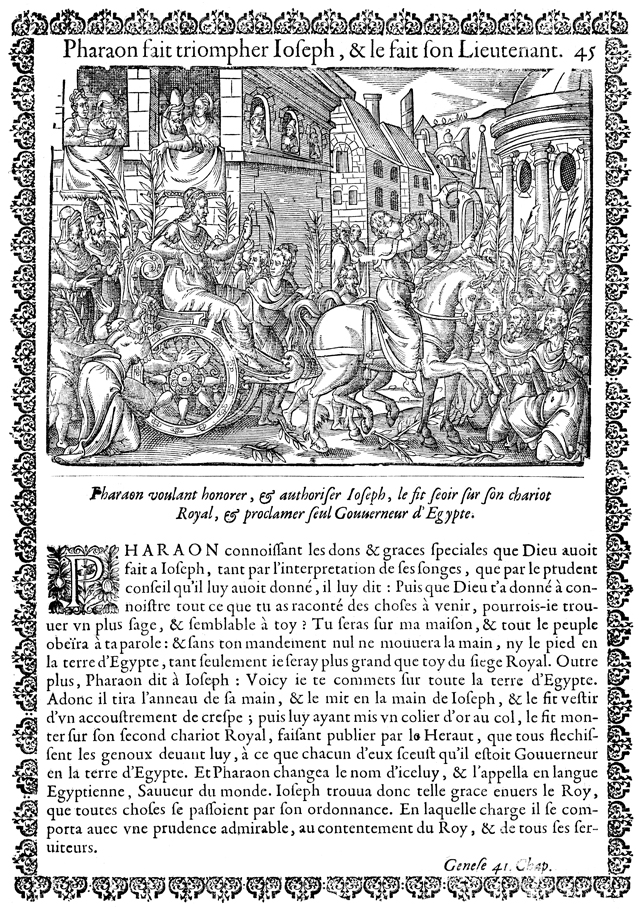 Description: Pleased with the interpretation Joseph gave of his dream, Pharaoh makes Joseph governor of Egypt, arrays him in fine linen, and parades him through the city in a chariot.