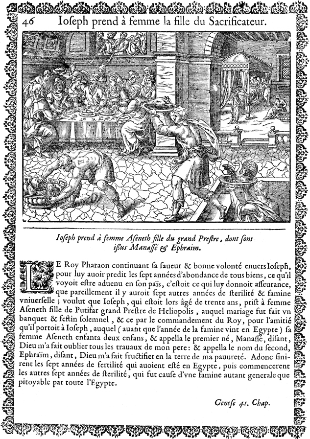 Description: Joseph and Asenath feast at their wedding banquet as servants bring them food and drink. In the bed chamber, maids clean Joseph and Asenath’s newborn sons, Manasseh and Ephraim.