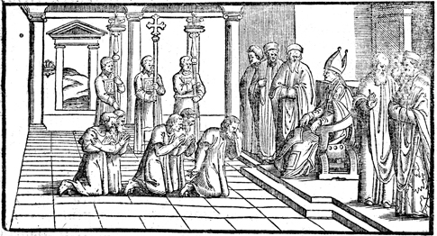 Description: This engraving is the first of three illustrating the public expulsion of penitents from the community of the church on Ash Wednesday. These are people who have committed grave crimes and on whom a solemn penance has been imposed. They come before the bishop dressed in poor clothing, barefoot and weeping. The bishop places ashes on the heads of each and another priest sprinkles them with holy water.