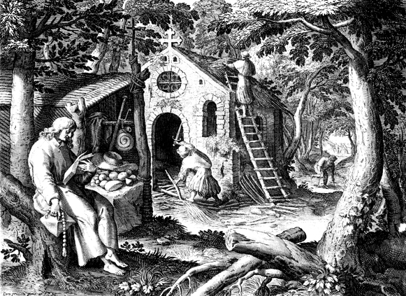 Description: Saint Robertus reads the scriptures while other monks construct a chapel in the woods. The names of the artist responsible for the design, Maarten De Vos, and the engraver, Raphael Sadeler I, are at the base .