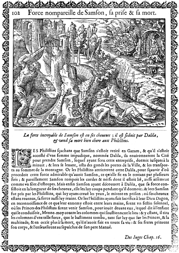 Description: In the foreground, Samson carries the city gates of Gaza, having evaded the ambush that the men of that city had plotted against him. To the right of this, Delilah cuts Samson’s hair, having discovered that it is the key to his incredible strength. The Philistines stand nearby, waiting for Samson’s strength to leave him. In the background, Samson, who has been captured by the Philistines after Delilah’s betrayal, brings the house down on himself and his Philistine captors.