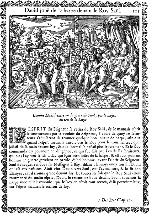 Description: David plays his lyre to soothe Saul, who is tormented by an evil spirit. In the background, David kills a lion to protect his flock.