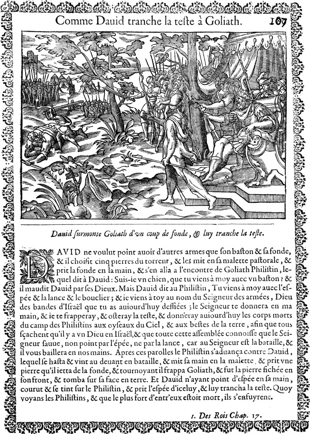 Description: After slaying Goliath, David takes a sword and cuts off Goliath’s head. Saul, his attendants, and his soldiers look on in astonishment.