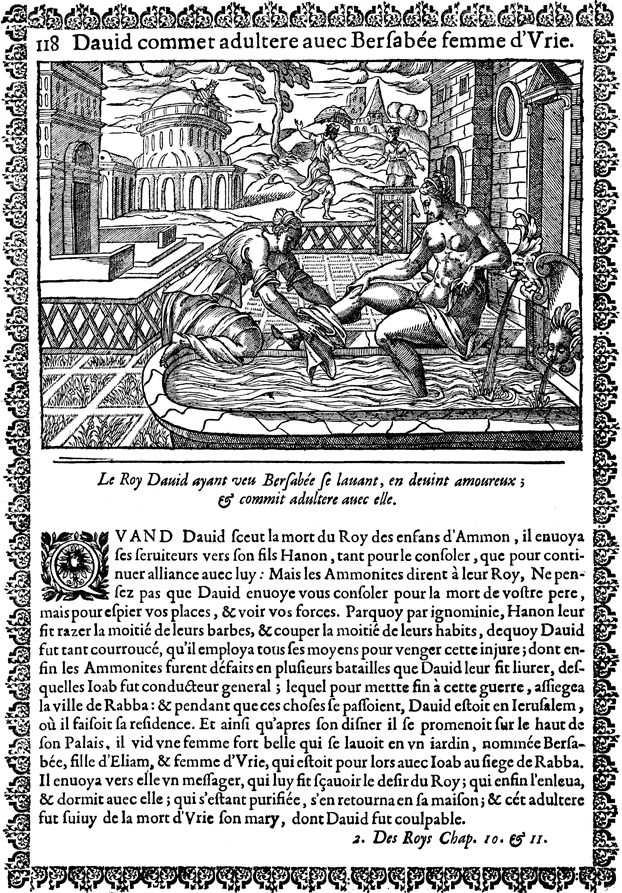 Description: As David looks down from a palace balcony, Bathsheba bathes in a pool, accompanied by an attendant, and David sends one of his messengers to get her.
