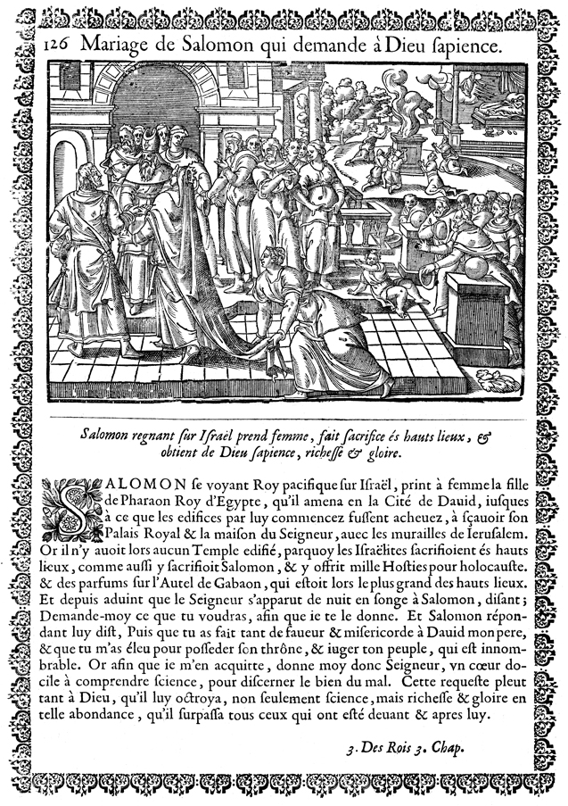 Description: In the foreground, a priest marries Solomon and Pharaoh’s daughter. In the background, God appears to Solomon in a dream and grants him the wisdom for which he asks. Outside Israelites make a sacrifice on one of the high places.