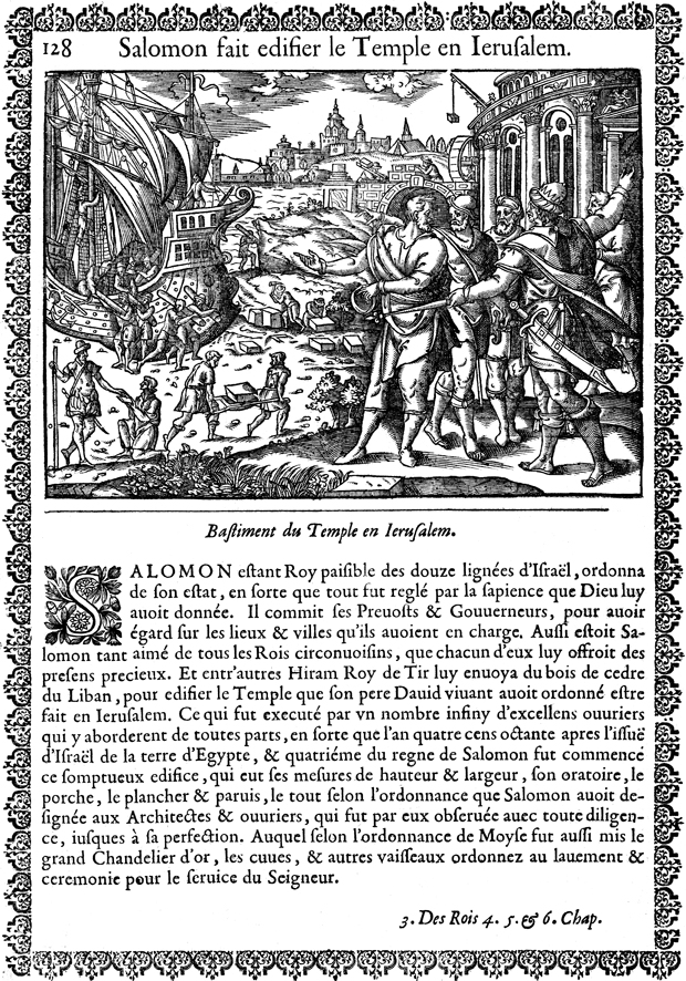 Description: King Hiram of Tyre sends materials to Solomon by way of ship for the construction of the Temple in Jerusalem. In the background, workers begin its construction.