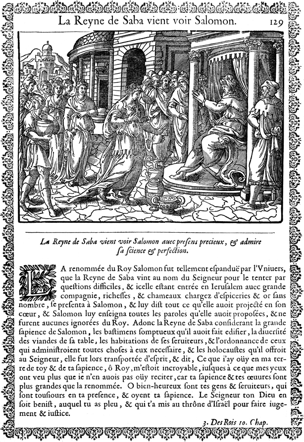 Description: The Queen of Sheba visits King Solomon in Jerusalem.