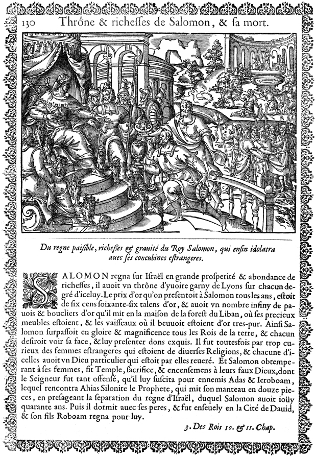 Description: Solomon sits on his resplendent throne and examines the items of wealth brought before him.