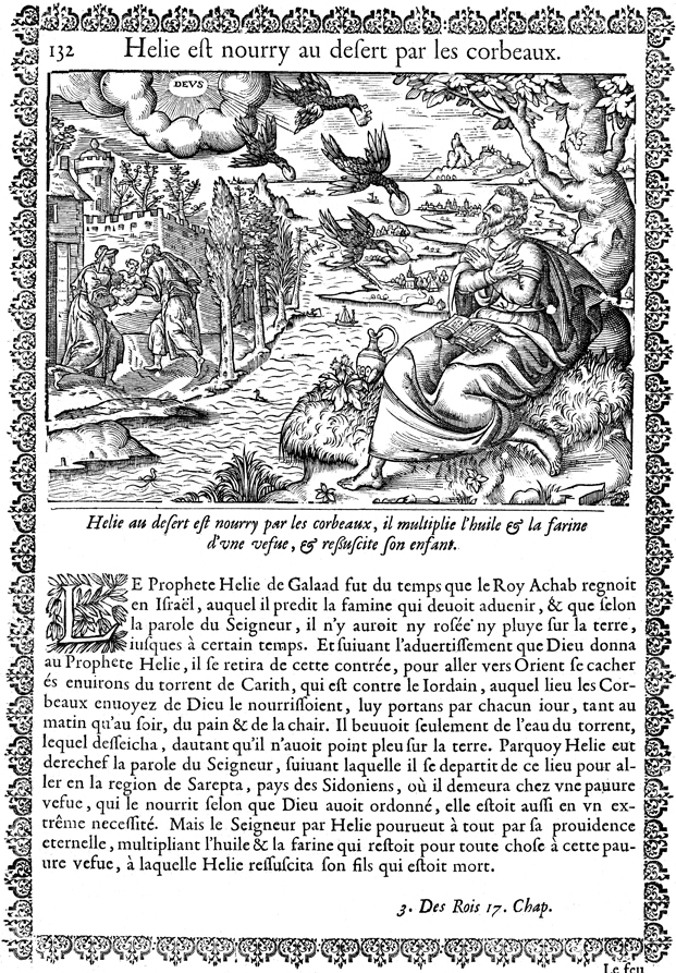 Description: God has commanded Elijah to hide himself by the Wadi Cherith, where God has sent ravens to feed him. To the left of the image, the widow with whom Elijah had been residing in Zarephath hands Elijah her son, who has fallen ill.