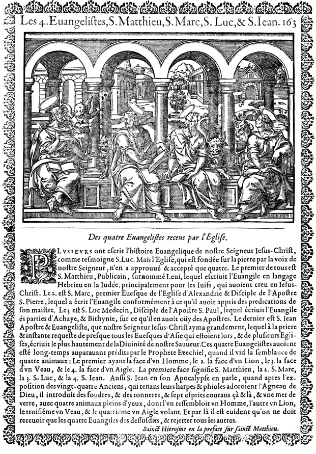 Description: The four evangelists, along with their attributes, sit in a courtyard with their gospels before them.