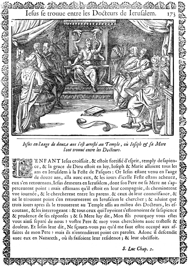 Description: Mary and Joseph find the twelve–year–old Jesus in the Temple sitting among the teachers and listening and asking questions.