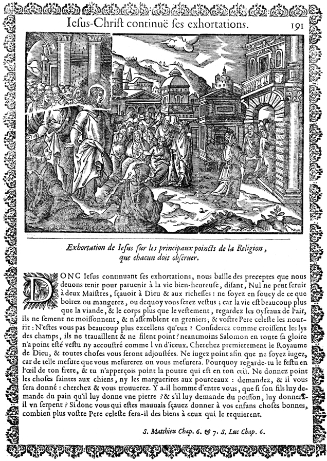 Description: Jesus continues teaching his disciples concerning true religion. The Pharisee praying before the synagogue to the right of the image alludes to Jesus’ teaching to pray in secret.