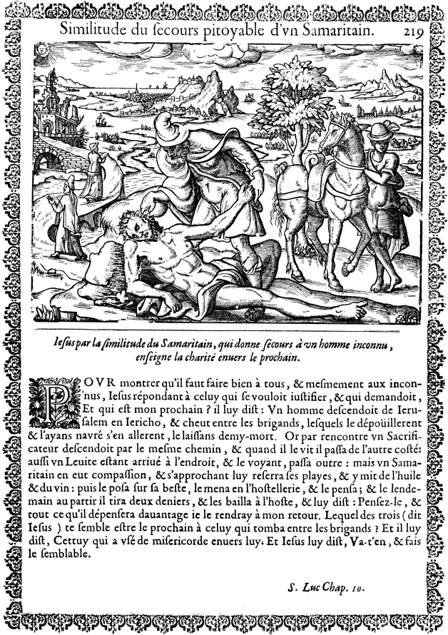 Description: Jesus tells the story of a Samaritan who stops to help a man wounded by thieves, while a priest and a Levite callously pass by the injured man on their way from Jerusalem to Jericho.