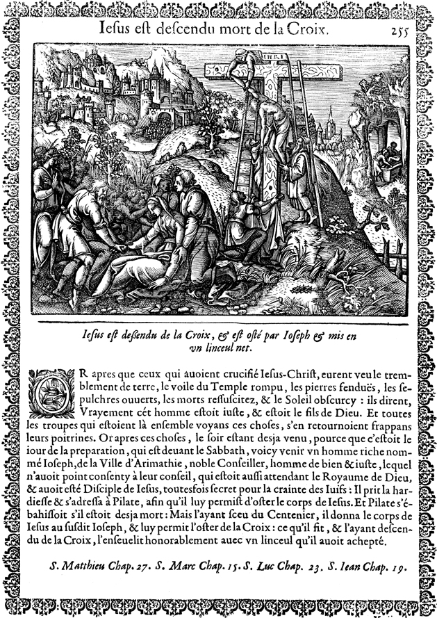 Description: Joseph of Arimethea has Jesus’ body removed from the cross for burial, as Jesus’ disciples comfort Jesus’ bereaved mother.