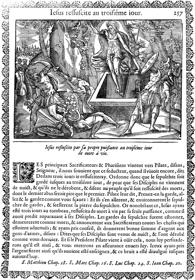 Description: The risen Christ emerges from the tomb, terrifying the centurions.
