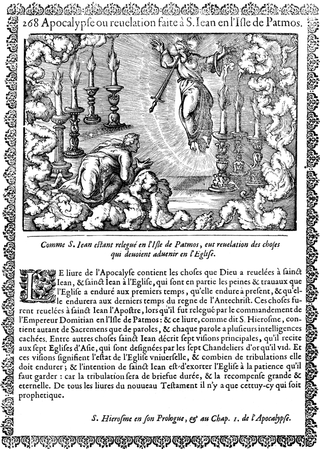 Description: One like the Son of Man appears to John of Patmos in a vision. John bows in reverence.