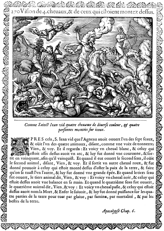 Description: After the first four seals are opened, four horsemen roam the earth bringing great calamity. They are shown carrying a bow, a sword, scales, and a scythe. Hades appears at the bottom–left.