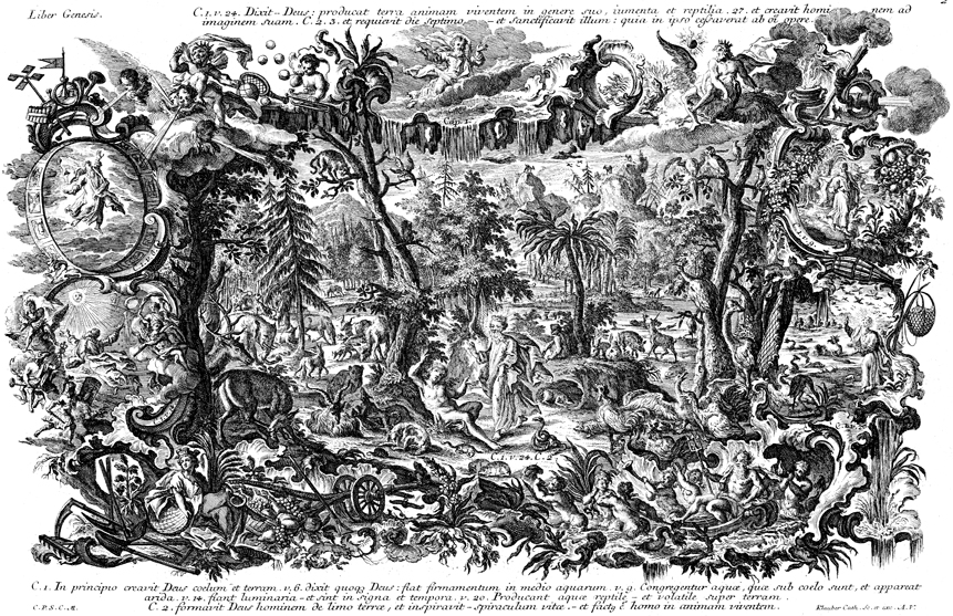 Description: This image, by Joseph Klauber (1700-1768), depicts God standing among the creation with Adam. The various days of creation are shown, with the creation of the sky to the upper-left, land to the upper-right, the sun, moon and stars to the lower-left, and animals to the lower-right. Figures from Greek mythology are in the corners, with Aeolus, the ruler of the winds in the top-left corner; Zeus, the King of the Gods in the top-right corner, with his attribute, a thunderbolt; Poseidon, the god of the sea, at the bottom-right; and Demeter, the goddess of the harvest, in the bottom-left corner.