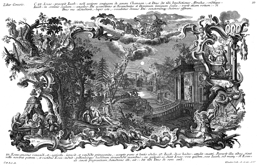 Description: This image depicts Jacob's vision of angels ascending and descending from heaven on a ladder. In the upper right-hand corner is Esau, selling his birthright to his brother Jacob for some stew. In the lower right-hand corner is Jacob taking a kid from the flock for his father’s meal, while in the lower left-hand corner are Rebekah and Jacob deceiving Isaac so that Jacob can receive Isaac’s blessing.