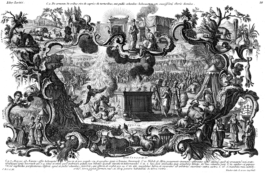 Description: This image depicts Nadab and Abihu being consumed by fire for offering an improper sacrifice, while to the right Aaron offers sacrifices to God on the altar, a sin offering and burnt offering for himself, and a sin offering and burnt offering for the people. At the bottom are the animals sacrificed as burnt-offerings. At the bottom-right Aaron receives instruction for entering the tent of meeting. To the upper-left are animals considered clean, that can be eaten, while to the upper-right are animals that are considered unclean, that cannot be eaten. At the top a woman brings an offering to the priest at the tent of meeting after giving birth. To the bottom-left a priest examines a man for leprosy. To the middle-left at the bottom is a cornucopia representing the harvest if the Israelites observe the commandments given to them by God, while to middle-right at the bottom is a cornucopia representing death if the Israelites do not follow the commandments.