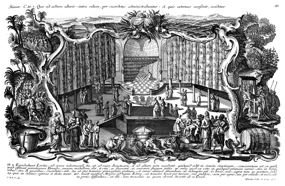 Description: This image depicts the Levites performing the tasks of the priesthood dealing with the tent of meeting, while Aaron performs the duties of the priesthood behind the curtain where the Ark of the Covenant rests. At the bottom middle-left and middle-right Levites are shown receiving offerings for the firstborn. The top and bottom corners of the images represent the agricultural offerings, while the bottom middle represents the offerings of livestock. To the right Edom is shown refusing passage through their land to the Israelites, while to the left the Israelites turn back from Edom.