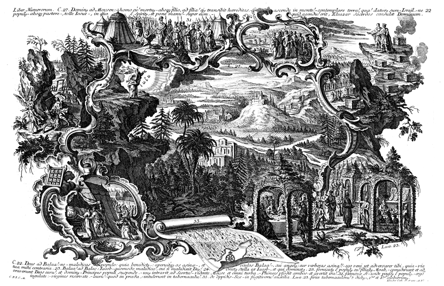 Description: This image depicts Moses viewing the Promised Land, but he is not permitted to enter it. To the top-left Balaam is stopped by an angel while riding his donkey. To the top-right Balaam blesses Israel, as King Balak, the king of Moab, stands next to the seven altars he built. To the bottom-left an Israelite man named Zimri brings a Midianite woman into his tent. At the top the Israelites gather the booty from their victory over the Midianites, while just to the right Moses designated cities for the Levites and cities of refuge. At the bottom is a map showing the Israelites’ route from Egypt through the wilderness to the Promised Land. At the bottom-right the Israelites celebrate the Festival of Booths, or Tabernacles.